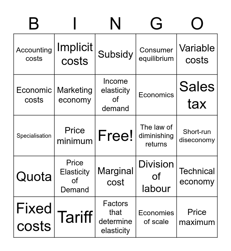 This bingo card has a free space and 25 words: Price Elasticity of Demand, Factors that determine elasticity, Income elasticity of demand, Fixed costs, Variable costs, Accounting costs, Economic costs, Implicit costs, The law of diminishing returns, Marginal cost, Economics, Specialisation, Division of labour, Technical economy, Marketing economy, Financial economy, Short-run diseconomy, Subsidy, Sales tax, Price minimum, Price maximum, Tariff, Quota, Consumer equilibrium and Economies of scale.