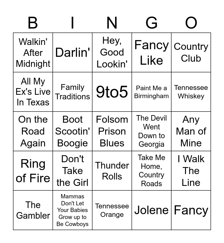 This bingo card has 35 words: Song of the South, Me And Bobby McGee, Amarillo By Morning, Family Traditions, Thunder Rolls, Fancy Like, All My Ex's Live In Texas, Highwayman, 9to5, Islands In The Stream, On the Road Again, Country Club, Strawberry Wine, Chattahoochie, Walkin' After Midnight, The Devil Went Down to Georgia, Jolene, Boot Scootin' Boogie, Ring of Fire, Folsom Prison Blues, Take Me Home, Country Roads, The Gambler, I Walk The Line, Mammas Don't Let Your Babies Grow up to Be Cowboys, Hey, Good Lookin', Tennessee Whiskey, Fancy, Dixieland Delight, Paint Me a Birmingham, Any Man of Mine, Country Boy Can Survive, Tennessee Orange, Don't Take the Girl, Darlin' and Just in Case.