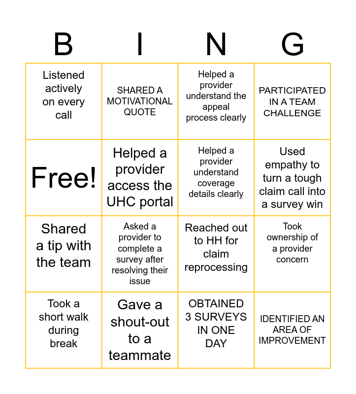This bingo card has 16 words: Gave a shout-out to a teammate, Took ownership of a provider concern, Helped a provider understand the appeal process clearly, Listened actively on every call, Shared a tip with the team, SHARED A MOTIVATIONAL QUOTE, Reached out to HH for claim reprocessing, OBTAINED 3 SURVEYS IN ONE DAY, Free!, Helped a provider access the UHC portal, Took a short walk during break, PARTICIPATED IN A TEAM CHALLENGE, Asked a provider to complete a survey after resolving their issue, Used empathy to turn a tough claim call into a survey win, Helped a provider understand coverage details clearly and IDENTIFIED AN AREA OF IMPROVEMENT.