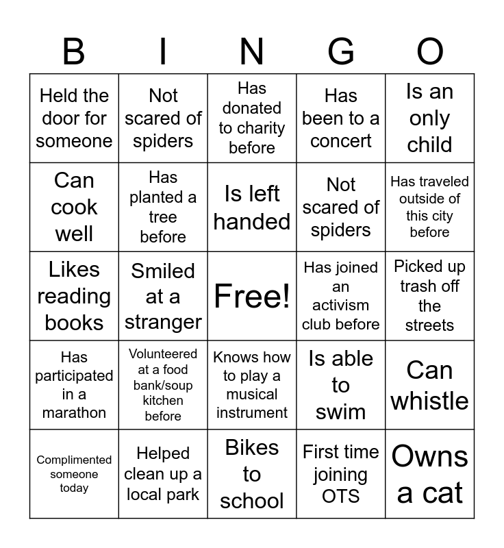 This bingo card has a free space and 29 words: Complimented someone today, Recycled today, Smiled at a stranger, Said "thank you" today, Held the door for someone, Has donated to charity before, Has planted a tree before, Volunteered at a food bank/soup kitchen before, Has joined an activism club before, Helped clean up a local park, Picked up trash off the streets, Owns a cat, Bikes to school, First time joining OTS, Has traveled outside of this city before, Watches sports, Knows how to play a musical instrument, Has participated in a marathon, Is an only child, Likes reading books, Is able to swim, Can speak a language other than English, Not scared of spiders, Can cook well, Has been to a concert, Not scared of spiders, Can whistle, Is left handed and Has a birthday this month.