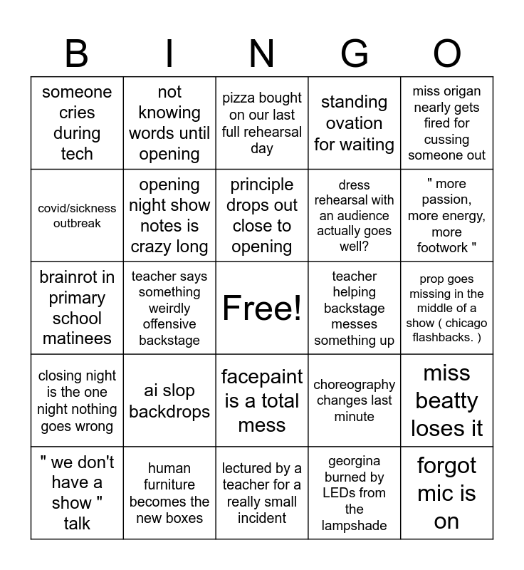 This bingo card has a free space and 24 words: ai slop backdrops, human furniture becomes the new boxes, principle drops out close to opening, " we don't have a show " talk, miss origan nearly gets fired for cussing someone out, someone cries during tech, covid/sickness outbreak, not knowing words until opening, teacher helping backstage messes something up, facepaint is a total mess, dress rehearsal with an audience actually goes well?, brainrot in primary school matinees, choreography changes last minute, miss beatty loses it, opening night show notes is crazy long, georgina burned by LEDs from the lampshade, prop goes missing in the middle of a show ( chicago flashbacks. ), pizza bought on our last full rehearsal day, " more passion, more energy, more footwork ", teacher says something weirdly offensive backstage, forgot mic is on, closing night is the one night nothing goes wrong, standing ovation for waiting and lectured by a teacher for a really small incident.