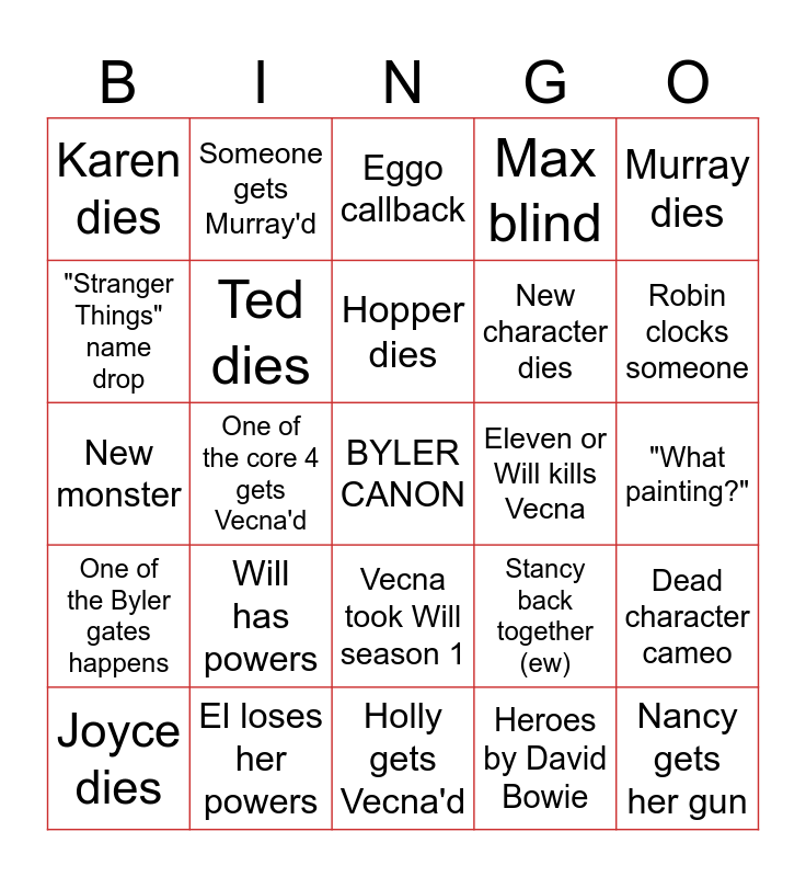 This bingo card has a free space and 24 words: Will has powers, El loses her powers, Hopper dies, Joyce dies, Murray dies, Karen dies, "Stranger Things" name drop, Someone gets Murray'd, Eleven or Will kills Vecna, Vecna took Will season 1, New character dies, New monster, Stancy back together (ew), Dead character cameo, Ted dies, Heroes by David Bowie, "What painting?", Eggo callback, Robin clocks someone, One of the core 4 gets Vecna'd, Nancy gets her gun, One of the Byler gates happens, Max blind and Holly gets Vecna'd.
