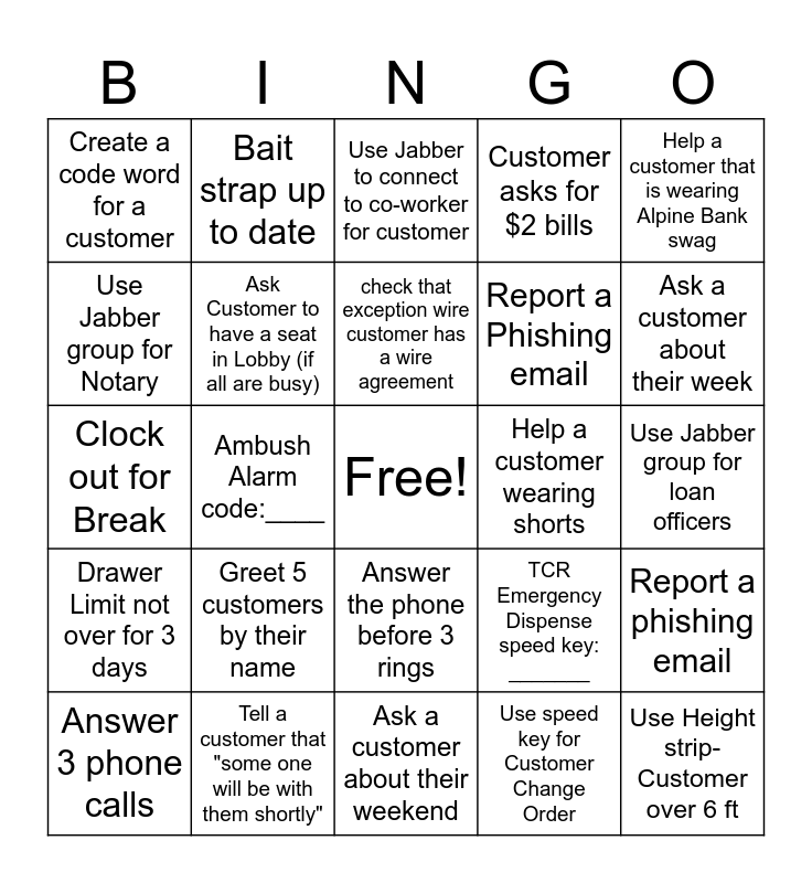 This bingo card has a free space and 29 words: Answer 3 phone calls, Explain the new Credit Card rewards to a customer or coworker, Ambush Alarm code:____, Tell a customer how to set low balance alerts on their App, Create a code word for a customer, Use Jabber to connect to co-worker for customer, Ask Customer to have a seat in Lobby (if all are busy), Greet 5 customers by their name, Help a customer wearing shorts, Tell a customer that "some one will be with them shortly", Use Jabber group for loan officers, Use Height strip-Customer over 6 ft, Ask a customer about their weekend, Use speed key for Customer Change Order, Ask a customer about their week, Tell a customer about Bill Pay and pay a person, Answer the phone before 3 rings, Drawer Limit not over for 3 days, Help a customer that is wearing Alpine Bank swag, Clock out for Break, TCR Emergency Dispense speed key: _______, Smile!, Report a Phishing email, Use Jabber group for Notary, Customer asks for $2 bills, Bait strap up to date, Report a phishing email, check that exception wire customer has a wire agreement and Customer cash's ~95% of check and balance deposit.