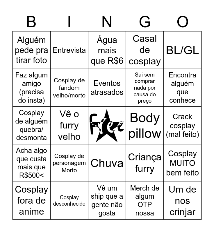 This bingo card has a free space and 24 words: Cosplay de personagem Morto, Cosplay desconhecido, Eventos atrasados, Cosplay fora de anime, BL/GL, Alguém pede pra tirar foto, Faz algum amigo (precisa do insta), Entrevista, Body pillow, Chuva, Sai sem comprar nada por causa do preço, Cosplay de alguém quebra/ desmonta, Criança furry, Cosplay MUITO bem feito, Cosplay de fandom velho/morto, Merch de algum OTP nossa, Crack cosplay (mal feito), Água mais que R$6, Encontra alguém que conhece, Vê o furry velho, Um de nos crinjar, Acha algo que custa mais que R$500<, Casal de cosplay and Vê um ship que a gente não gosta.