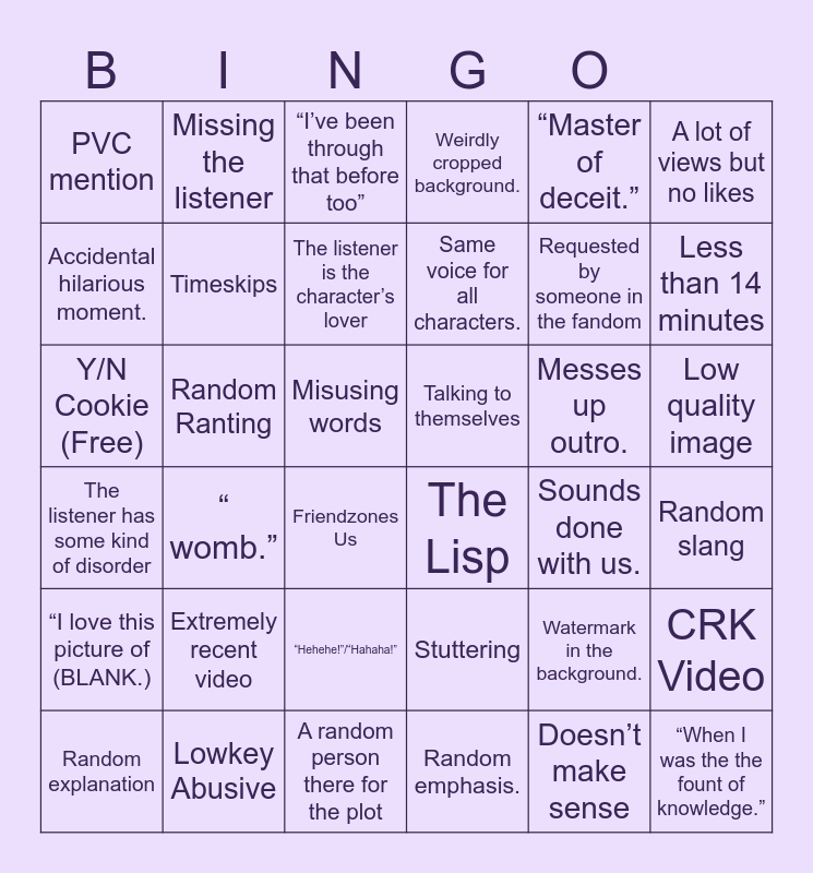 This bingo card has 36 words: Stuttering, “Hehehe!”/“Hahaha!”, Random emphasis., Accidental hilarious moment., The listener has some kind of disorder, Talking to themselves, Timeskips, A random person there for the plot, “Master of deceit.”, Watermark in the background., Less than 14 minutes, Weirdly cropped background., CRK Video, Random Ranting, Same voice for all characters., PVC mention, “I love this picture of (BLANK.), Messes up outro., Y/N Cookie (Free), “I’ve been through that before too”, Misusing words, “ womb.”, The Lisp, Friendzones Us, Sounds done with us., Missing the listener, Requested by someone in the fandom, Lowkey Abusive, The listener is the character’s lover, A lot of views but no likes, “When I was the the fount of knowledge.”, Random explanation, Random slang, Low quality image, Extremely recent video and Doesn’t make sense.