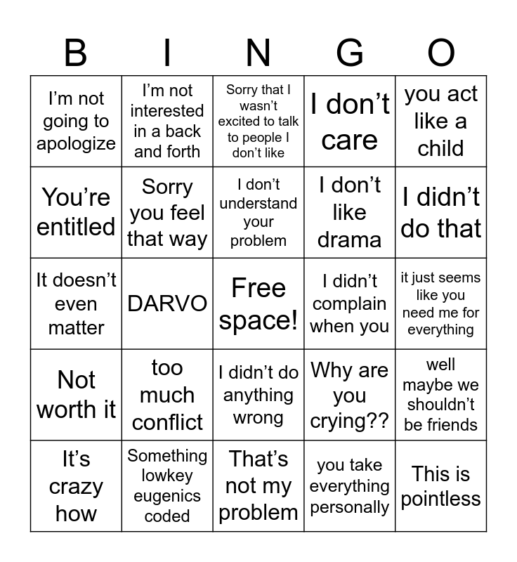 This bingo card has a free space and 26 words: I didn’t do anything wrong, you take everything personally, I don’t understand your problem, Something lowkey eugenics coded, you act like a child, I’m not going to apologize, You’re entitled, I’m not interested in a back and forth, it just seems like you need me for everything, Why are you crying??, I don’t like drama, It doesn’t even matter, well maybe we shouldn’t be friends, It’s crazy how, DARVO, We’re not dating, I don’t care, Not worth it, Sorry that I wasn’t excited to talk to people I don’t like, This is pointless, I didn’t do that, That’s not my problem, I didn’t complain when you, too much conflict, Sorry you feel that way and You’re being ridiculous.