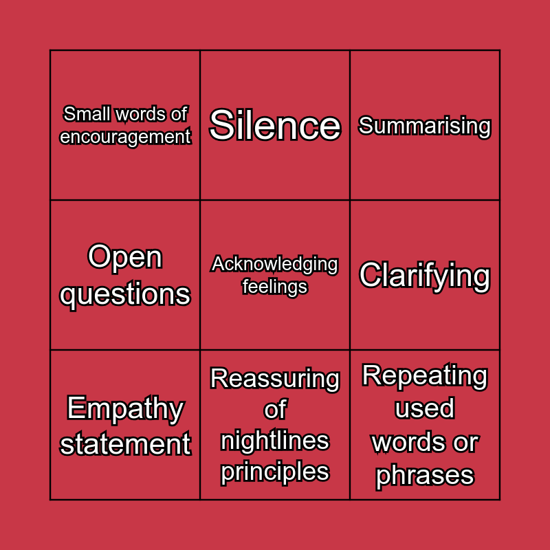 This bingo card has 9 words: Empathy statement, Summarising, Silence, Open questions, Small words of encouragement, Clarifying, Acknowledging feelings, Repeating used words or phrases and Reassuring of nightlines principles.