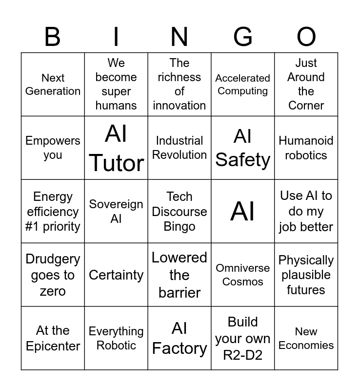 This bingo card has a free space and 24 words: Certainty, Everything Robotic, Industrial Revolution, At the Epicenter, Just Around the Corner, Next Generation, Empowers you, We become super humans, AI, Lowered the barrier, AI Safety, Energy efficiency #1 priority, Omniverse Cosmos, Physically plausible futures, AI Tutor, Build your own R2-D2, Use AI to do my job better, The richness of innovation, Humanoid robotics, Sovereign AI, New Economies, Drudgery goes to zero, Accelerated Computing and AI Factory.