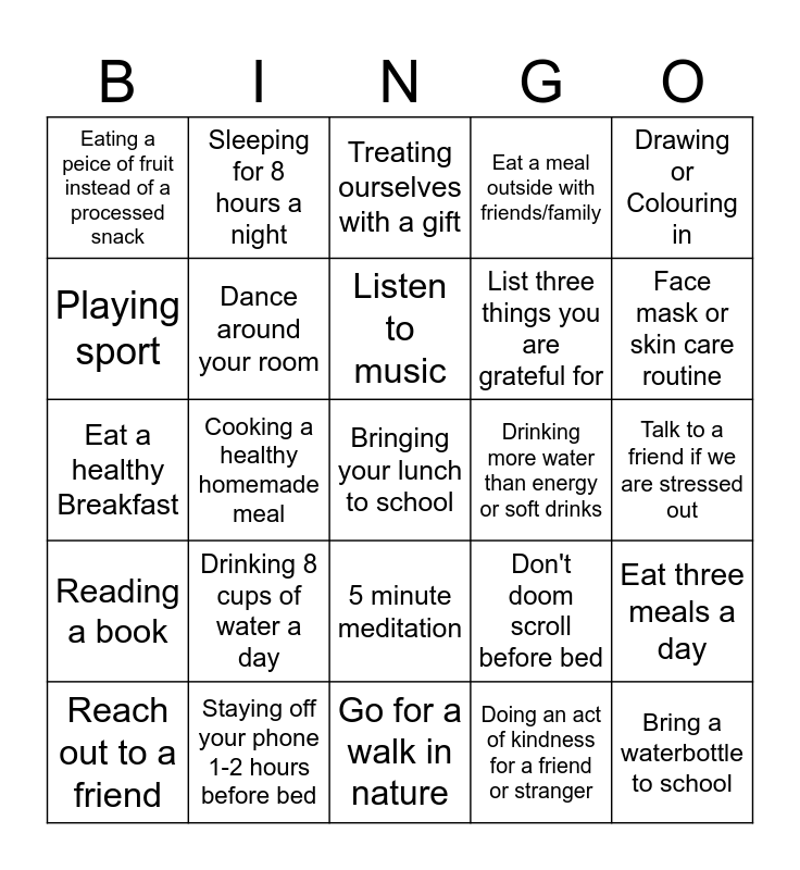 This bingo card has 25 words: Drinking 8 cups of water a day, Go for a walk in nature, Listen to music, Reach out to a friend, Drawing or Colouring in, Eating a peice of fruit instead of a processed snack, Playing sport, Sleeping for 8 hours a night, Drinking more water than energy or soft drinks, 5 minute meditation, List three things you are grateful for, Eat a healthy Breakfast, Don't doom scroll before bed, Eat three meals a day, Dance around your room, Bring a waterbottle to school, Talk to a friend if we are stressed out, Treating ourselves with a gift, Face mask or skin care routine, Cooking a healthy homemade meal, Bringing your lunch to school, Staying off your phone 1-2 hours before bed, Reading a book, Eat a meal outside with friends/family and Doing an act of kindness for a friend or stranger.
