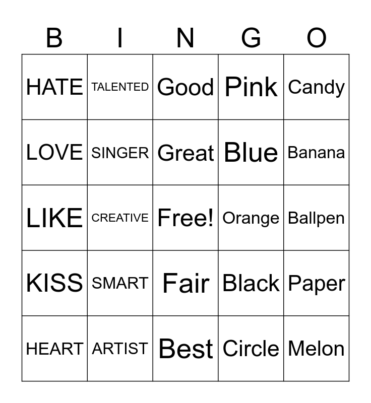 This bingo card has a free space and 24 words: HEART, SMART, Great, Circle, Candy, HATE, TALENTED, Good, Orange, Ballpen, LIKE, SINGER, Black, Paper, LOVE, ARTIST, Best, Pink, Banana, KISS, CREATIVE, Fair, Blue and Melon.