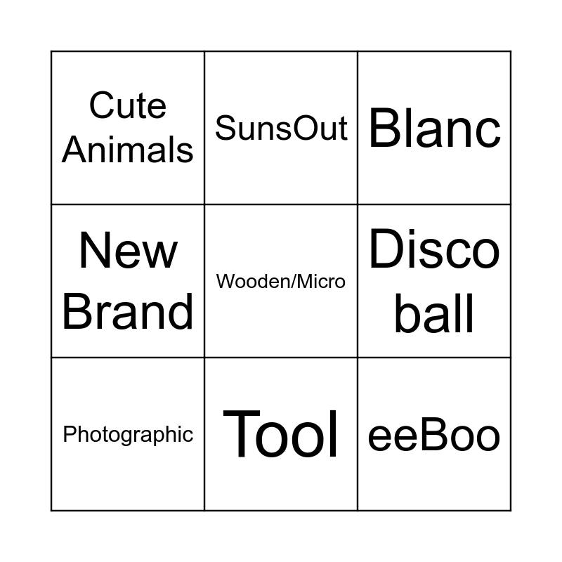 This bingo card has 27 words: Free!, Mushrooms, eeBoo, Squirrels, Disco ball, Blanc, SunsOut, Wheels, JaCaRou, Disney, VCC, New Brand, Ravensburger, Camel, NYPC, Cobble Hill, Photographic, Tool, Hats, Cute Animals, Dowdle, Luxury Brand, Positivity, MasterPieces, Music, Wooden/Micro and Umbrella.