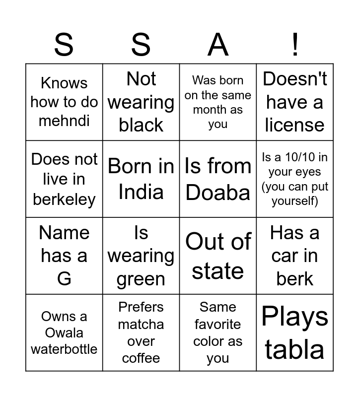 This bingo card has 35 words: Transfer Student, First SSA Meeting, Is left handed, Is from Doaba, Did amrit vela this week, Doesn't have a license, Born in India, Is performative, Is a 10/10 in your eyes (you can put yourself), On SSA Board, Out of state, Does not live in berkeley, Has ridden a tractor, Can tie a clean parna, Knows how to do mehndi, Prefers matcha over coffee, Part of bhangra or giddha team, Has a car in berk, Plays tabla, Owns a Owala waterbottle, Doesn't know how to ride a bike, Can speak more than 3 languages, Uses an android, Is a graduate student, Was born on the same month as you, Is wearing green, Is taller than you, Is not wearing a kara, Name has a G, Same favorite color as you, Can roll their tongue, likes pineapple on pizza, Loves drake, Not wearing black and Is an only child.