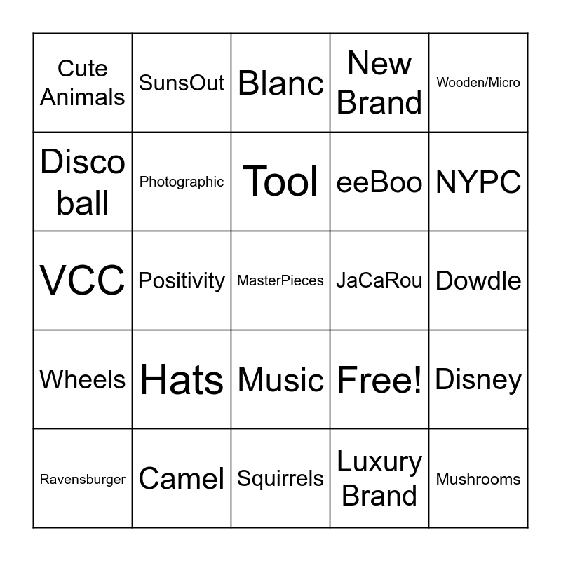 This bingo card has 27 words: Free!, Mushrooms, eeBoo, Squirrels, Disco ball, Blanc, SunsOut, Wheels, JaCaRou, Disney, VCC, New Brand, Ravensburger, Camel, NYPC, Cobble Hill, Photographic, Tool, Hats, Cute Animals, Dowdle, Luxury Brand, Positivity, MasterPieces, Music, Wooden/Micro and Umbrella.