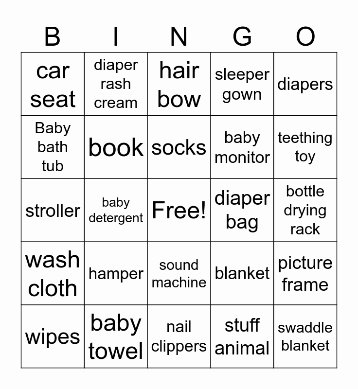 This bingo card has a free space and 34 words: pacifier, stuff animal, onesie, bib, wash cloth, book, diapers, wipes, diaper rash cream, bottles, socks, hair bow, dress, shoes, diaper bag, teething toy, baby towel, stroller, hamper, blanket, sound machine, thermometer, car seat, bottle drying rack, nail clippers, swaddle blanket, sleeper gown, changing pad, baby monitor, Baby bath tub, Baby play mat, baby detergent, picture frame and burp cloths.