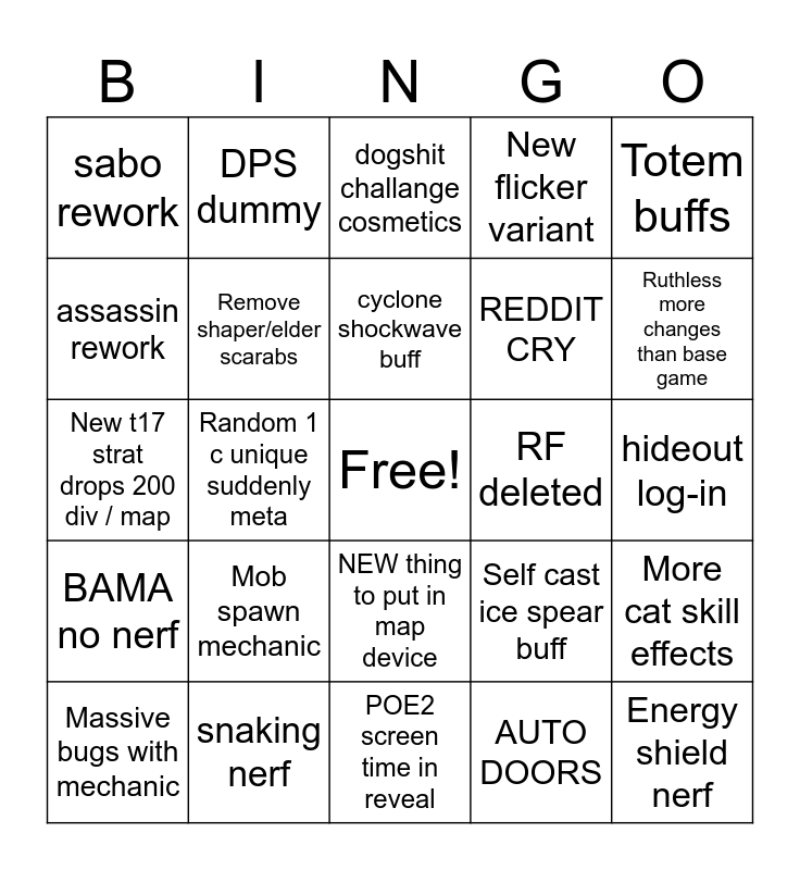 This bingo card has a free space and 24 words: Mob spawn mechanic, snaking nerf, cyclone shockwave buff, Massive bugs with mechanic, Totem buffs, sabo rework, assassin rework, DPS dummy, RF deleted, NEW thing to put in map device, REDDIT CRY, New t17 strat drops 200 div / map, Self cast ice spear buff, More cat skill effects, Remove shaper/elder scarabs, AUTO DOORS, hideout log-in, dogshit challange cosmetics, Ruthless more changes than base game, Random 1 c unique suddenly meta, Energy shield nerf, BAMA no nerf, New flicker variant and POE2 screen time in reveal.
