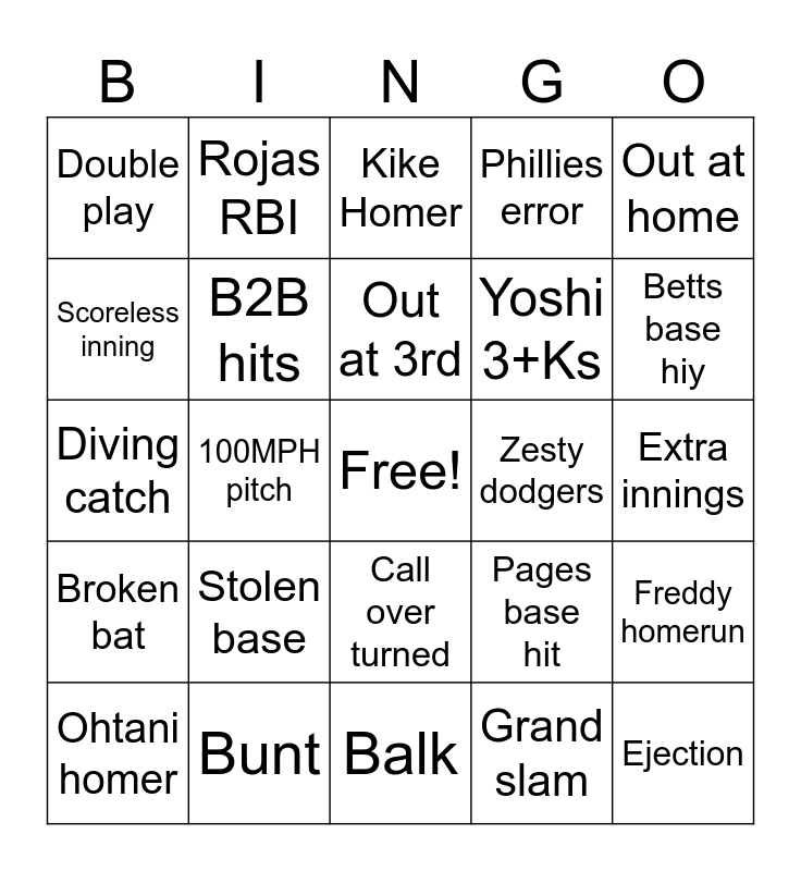 This bingo card has a free space and 29 words: Ohtani homer, NRFI, 100MPH pitch, Dodgers 3 plus Runs, Double play, Kike Homer, B2B hits, Stolen base, Zesty dodgers, Bunt, Extra innings, Ejection, Balk, Grand slam, Betts base hiy, Triple, Call over turned, Broken bat, Out at home, Diving catch, Pages base hit, HBP, Yoshi 3+Ks, Scoreless inning, Phillies error, Rojas RBI, Freddy homerun, Out at 3rd and Celeb spotting.