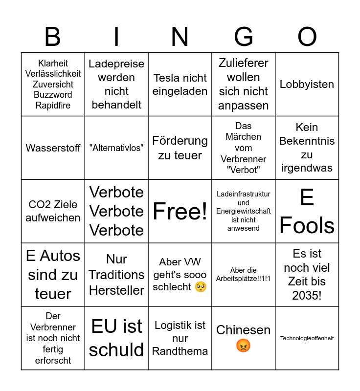 This bingo card has a free space and 24 words: Nur Traditions Hersteller, EU ist schuld, Förderung zu teuer, Der Verbrenner ist noch nicht fertig erforscht, Lobbyisten, Klarheit Verlässlichkeit Zuversicht Buzzword Rapidfire, Wasserstoff, Ladepreise werden nicht behandelt, Ladeinfrastruktur und Energiewirtschaft ist nicht anwesend, Aber VW geht's sooo schlecht 🥺, Das Märchen vom Verbrenner "Verbot", CO2 Ziele aufweichen, Aber die Arbeitsplätze!!1!1, Es ist noch viel Zeit bis 2035!, "Alternativlos", Chinesen 😡, E Fools, Tesla nicht eingeladen, Kein Bekenntnis zu irgendwas, Verbote Verbote Verbote, Technologieoffenheit, E Autos sind zu teuer, Zulieferer wollen sich nicht anpassen and Logistik ist nur Randthema.