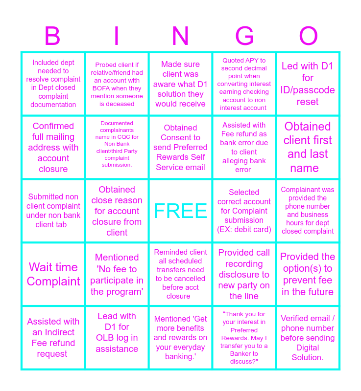 This bingo card has a free space and 24 words: Mentioned 'No fee to participate in the program', Lead with D1 for OLB log in assistance, Obtained Consent to send Preferred Rewards Self Service email, Assisted with an Indirect Fee refund request, Led with D1 for ID/passcode reset, Included dept needed to resolve complaint in Dept closed complaint documentation, Confirmed full mailing address with account closure, Probed client if relative/friend had an account with BOFA when they mention someone is deceased, Selected correct account for Complaint submission (EX: debit card), Reminded client all scheduled transfers need to be cancelled before acct closure, Assisted with Fee refund as bank error due to client alleging bank error, Submitted non client complaint under non bank client tab, Provided call recording disclosure to new party on the line, Provided the option(s) to prevent fee in the future, Documented complainants name in CQC for Non Bank client/third Party complaint submission., “Thank you for your interest in Preferred Rewards. May I transfer you to a Banker to discuss?", Complainant was provided the phone number and business hours for dept closed complaint, Made sure client was aware what D1 solution they would receive, Obtained client first and last name, Obtained close reason for account closure from client, Verified email / phone number before sending Digital Solution., Wait time Complaint, Quoted APY to second decimal point when converting interest earning checking account to non interest account and Mentioned 'Get more benefits and rewards on your everyday banking.'.