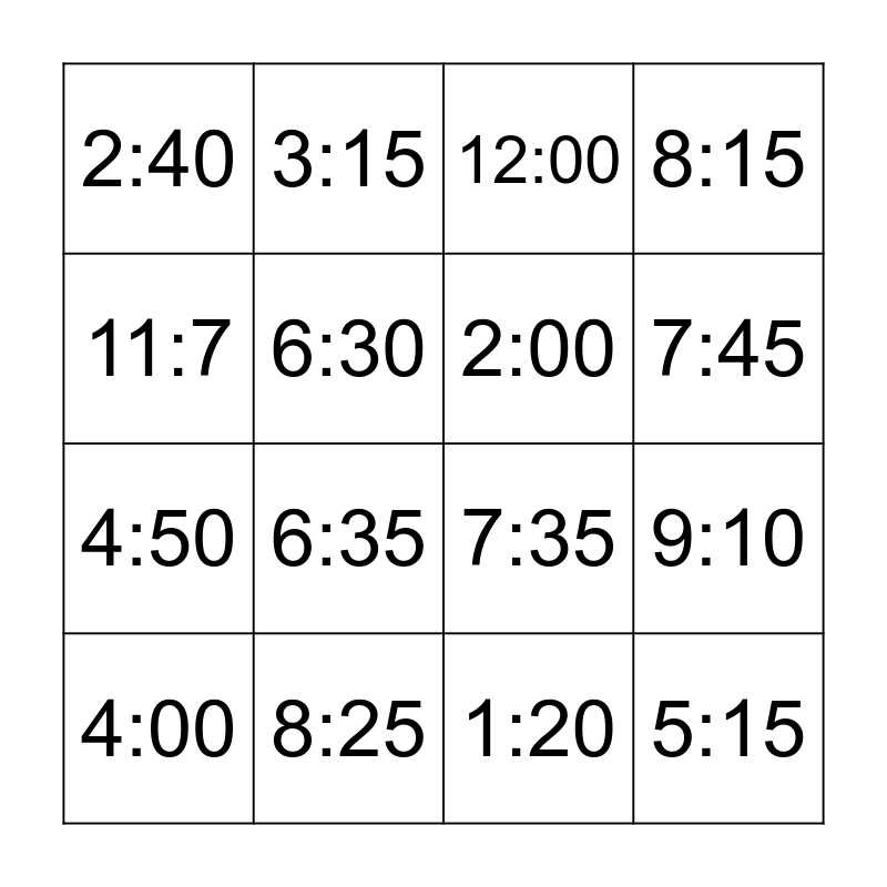 This bingo card has 16 words: 8:25, 9:10, 12:00, 2:40, 4:50, 3:15, 7:35, 1:20, 11:7, 6:30, 4:00, 8:15, 6:35, 7:45, 2:00 and 5:15.