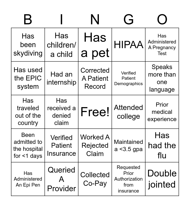 This bingo card has a free space and 24 words: Verified Patient Insurance, Queried A Provider, Corrected A Patient Record, Has Administered An Epi Pen, Has Administered A Pregnancy Test, Has been skydiving, Has used the EPIC system, Has children/ a child, Attended college, Worked A Rejected Claim, Verified Patient Demographics, Has traveled out of the country, Maintained a <3.5 gpa, Has had the flu, Had an internship, Requested Prior Authorization from insurance, Prior medical experience, Has a pet, Speaks more than one language, Has received a denied claim, Double jointed, Been admitted to the hospital for <1 days, HIPAA and Collected Co-Pay.