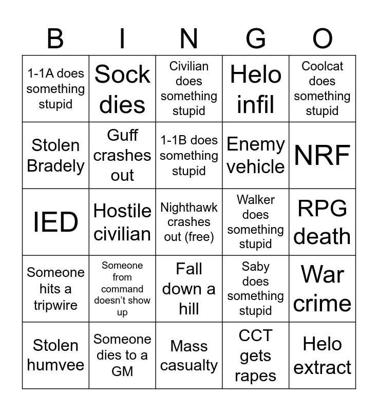 This bingo card has a free space and 34 words: Command gives vague answer, CCT gets rapes, Bad frag, GM civilian, Someone hits a tripwire, Guff crashes out, Coolcat does something stupid, Stolen humvee, Sock dies, Lurac takes over 1-1A, 1-1B does something stupid, Civilian does something stupid, Taliban, Medic dies, Walker does something stupid, NRF, Someone dies to a GM, IED, Someone from command doesn’t show up, Saby does something stupid, Fall down a hill, Sniper Death, 1-1A does something stupid, RPG death, Mass casualty, Helo extract, Helo infil, Convoy, Enemy vehicle, Stolen Bradely, Suicide bomber, Hostile civilian, War crime and Mortar strike.