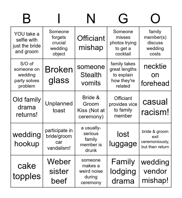 This bingo card has a free space and 93 words: someone speaks/interjects during ceremony, someone's phone goes off during ceremony, someone makes a weird noise during ceremony, someone criticizes food, someone criticizes table settings, snide comment about officiant, snide comment about wedding tradition, cake topples, charles sparkles, car troubles!, nature-related mishap, mom vs mom conflict, VERY STRESSFUL SITUATION where nobody says anything, family takes great lengths to explain how they're related, Dads bond over political affiliation, family member(s) discuss wedding costs, Officiant mishap, Rude text from non-attendee, Wedding Crasher, Someone other than bride wears white, Bride/Groom/Officiant flubs common wedding words, Someone in pond, someone in a tree, someone stands on table, shed, car, or similar structure, participate in bride/groom car vandalism!, Broken glass, Guest breaks property, pedantic complaint, Passive aggression by family or party member, Micus brother beef, Weber sister beef, a usually-serious family member is drunk, Wedding party member drunk at ceremony, Wedding party member loudly proclaims non-word, Someone forgets crucial wedding object, Razorbacks win, Vols win, Birth / wedding baby?, someone Stealth vomits, lost luggage, Old family drama returns!, wedding hookup, casual racism!, Someone falls while dancing, wedding vendor mishap!, Squash Pipe 3.0 (Plumbing mishap), Rain, Someone gives Anti-marriage sentiment, "When are you having kids", "When are you moving in together", Comment/Question on Bride & Groom $$ / prenup / finances, Family lodging drama, Midwestern vs Southern Culture clash, Photo Bomber, see a Bear, Wedding party member sleeps through alarm / misses deadline, Bride dress stained/ripped, Groom suit stained/ripped, Someone drops drink, The best food is already gone when everything else is over half full, Unplanned toast, cringe speech, someone makes a speech about themself, Parent criticizes adult child, Family member complains about a person's appearance, non-bridesmaid catches bouquet, Bridesmaid vs groomsman, Bridesmaid/groomsmen asked when theyre getting married, S/O of someone on wedding party solves problem, S/O of someone on wedding party creates problem, 3 People not in wedding party hanging out during rehearsal, Someone briefly catches on fire, cigar!, Someone misses photos trying to get a cocktail, someone gets lost in woods, someone breaks a shoe, necktie on forehead, bride & groom exit ceremoniously, but then return, Bride/groom get cake on face, People say My wife like "Maaaai Waiiife", "Ol Ball and Chain", Divorce joke!, Officiant provides vice to family member, YOU take a selfie with just the bride and groom, YOU dance with someone you didn't plan to dance with, a name is mispronounced, Wedding party wardrobe malfunciton, YOU Moon the bride or groom (and don't get caught), Wedding party member cries, Nerds try to dance Hip Hop, Children-related-Chaos, "We've have been married # years" and dance floor fills when song about breakup/cheating/toxic relationship plays.
