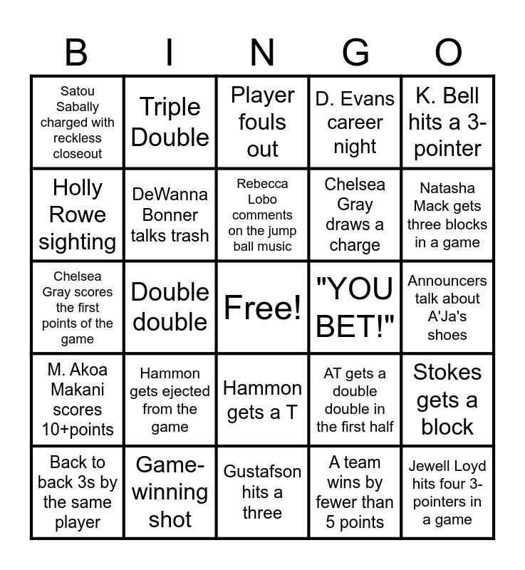 This bingo card has a free space and 44 words: AT makes a three, Jewell Loyd hits four 3- pointers in a game, Copper scores 25+ in a game, Back to back 3s by the same player, Ryan says "Thus", A team wins by fewer than 5 points, Player fouls out, A team wins by 15+, K. Bell hits a 3-pointer, Game-winning shot, D. Evans career night, "YOU BET!", Hammon gets a T, Hammon gets ejected from the game, Review takes more than five minutes, Gustafson hits a three, Buzzer beater shot to end a quarter, Chelsea Gray scores the first points of the game, Caitlin Clark is mentioned, Natasha Mack gets three blocks in a game, Triple Double, Any of the NFL Raiders are shown courtside, A player gets ejected in a game, Satou Sabally charged with reckless closeout, Flagrant Foul, Announcers talk about A'Ja's shoes, CBA mentioned, Chelsea Gary gets 10+ assists in a game, AT gets a double double in the first half, M. Akoa Makani scores 10+points, Diana Taurasi is shown courtside, Stokes gets a block, Sami Whitcomb hits the first 3 of the game, At draws a charge, Double double, Sabally scores 25+, Tie game going into the fourth quarter, Announcer mentions coaches being fined, Rebecca Lobo comments on the jump ball music, Holly Rowe sighting, Chelsea Gray draws a charge, Dana Evans gets a steal, DeWanna Bonner talks trash and Sheryl Swoopes sighting.