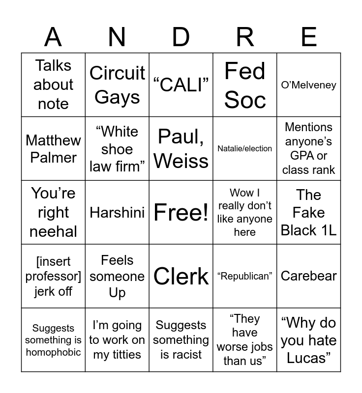 This bingo card has a free space and 24 words: Feels someone Up, I’m going to work on my titties, Paul, Weiss, Suggests something is homophobic, O’Melveney, Talks about note, Matthew Palmer, Circuit Gays, Wow I really don’t like anyone here, Clerk, Natalie/election, You’re right neehal, “Republican”, Carebear, “White shoe law firm”, “They have worse jobs than us”, The Fake Black 1L, “CALI”, Mentions anyone’s GPA or class rank, Harshini, “Why do you hate Lucas”, [insert professor] jerk off, Fed Soc and Suggests something is racist.