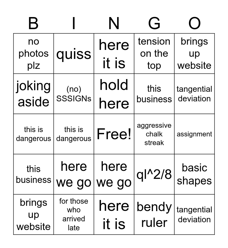 ⚠ This card has duplicate items: tyvm (2), tangential deviation (2), who wrote this (2), here it is (2), here we go (2), watch this (2), quiss (2), CO-LAWN (2), joking aside (2), for those who arrived late (2), (no) SSSIGNs (2), tension on the top (2), basic shapes (2), ql^2/8 (2), assignment (2), cut (2), hold here (2), aggressive chalk streak (2), aggressive tapping (2), brings up website (2), this is dangerous (2), bendy ruler (2), no photos plz (2), this business (2)