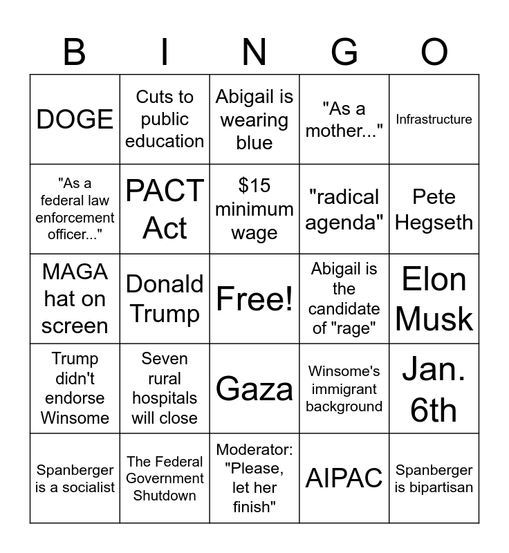 This bingo card has a free space and 54 words: Glenn Youngkin, Trump didn't endorse Winsome, Winsome's bus tour got cancelled, Social Security Fairness Act, Gaza, Trump's Big Beautiful Bill, "As a mother...", "As a Marine...", "As a federal law enforcement officer...", Dominion Energy, DOGE, Jay Jones, The Federal Government Shutdown, Spanberger is a socialist, Democrats are extremists, Moderator: "Please, let her finish", Spanberger is bipartisan, "radical agenda", Chuck Schumer, Elon Musk, Winsome's immigrant background, Joe Biden, Abigail is the candidate of "rage", Infrastructure, Abigail voted to lower the cost of insulin, Cuts to public education, VA has 147,358 federal workers, "I've delivered for VA", Ukraine, AIPAC, Build Back Better, Barack Obama, Kamala Harris, JD Vance, Abigail is wearing blue, Winsome is wearing red, MAGA hat on screen, Jan. 6th, CIA, PACT Act, "Support our veterans", Affordable Housing, Cannabis, 300,000 Virginians will lose healthcare, Seven rural hospitals will close, Virginia Clean Economy Act, Small business owners, in vitro fertilization (IVF), $15 minimum wage, Donald Trump, Pete Hegseth, John Thune, Mike Johnson and Hakeem Jeffries.