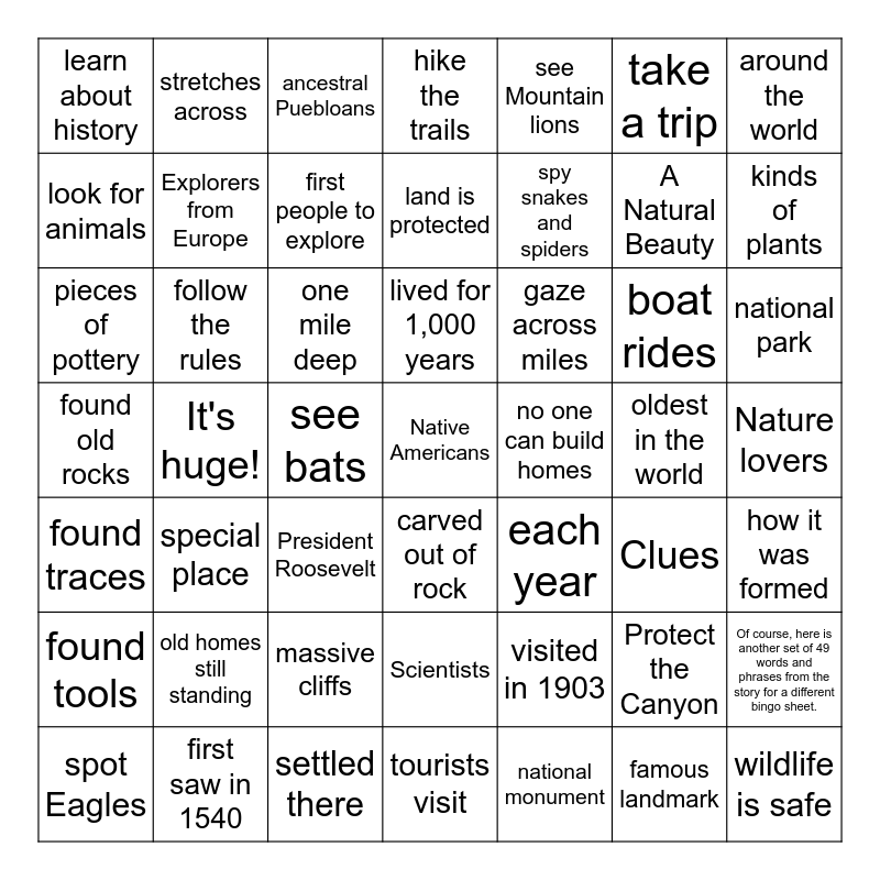 This bingo card has 50 words: Of course, here is another set of 49 words and phrases from the story for a different bingo sheet., A Natural Beauty, famous landmark, It's huge!, one mile deep, carved out of rock, stretches across, tourists visit, take a trip, each year, around the world, hike the trails, boat rides, gaze across miles, massive cliffs, Nature lovers, look for animals, kinds of plants, spot Eagles, see Mountain lions, spy snakes and spiders, see bats, learn about history, Explorers from Europe, first saw in 1540, Native Americans, first people to explore, settled there, ancestral Puebloans, lived for 1,000 years, farmers and hunters, found traces, old homes still standing, Scientists, found old rocks, oldest in the world, Clues, how it was formed, found tools, pieces of pottery, President Roosevelt, visited in 1903, special place, national monument, national park, land is protected, no one can build homes, Protect the Canyon, follow the rules and wildlife is safe.