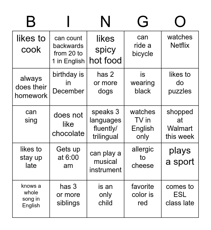 This bingo card has 30 words: has 3 or more siblings, was born in Cuba, does not like chocolate, can sew, likes to cook, likes spicy hot food, birthday is in December, can play a musical instrument, watches TV in English only, is an only child, shopped at Walmart this week, speaks 3 languages fluently/ trilingual, favorite color is red, comes to ESL class late, likes to do puzzles, never built a snowman, allergic to cheese, likes to stay up late, Gets up at 6:00 am, watches Netflix, can sing, has a tattoo, can count backwards from 20 to 1 in English, is wearing black, always does their homework, can ride a bicycle, plays a sport, knows a whole song in English, has 2 or more dogs and uses English at work.