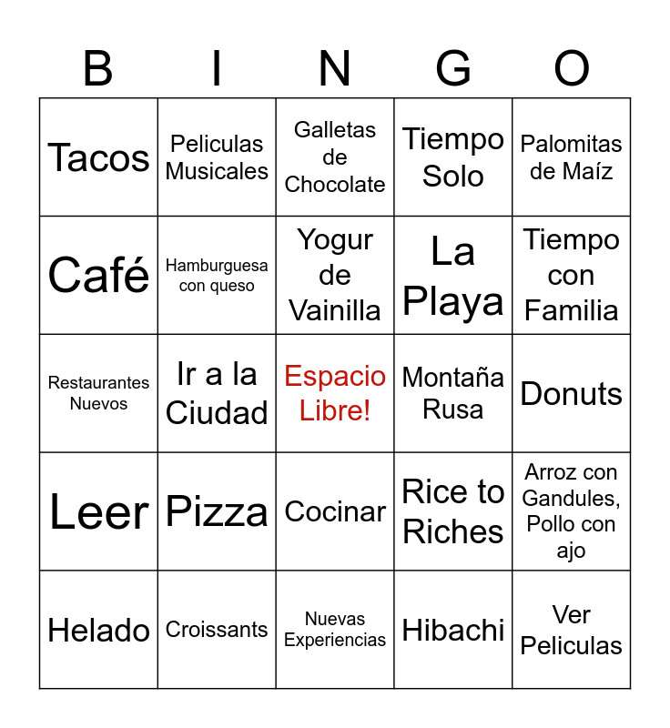 This bingo card has a free space and 24 words: Pizza, Croissants, Yogur de Vainilla, Helado, Palomitas de Maíz, Tacos, Café, Peliculas Musicales, Montaña Rusa, Cocinar, La Playa, Restaurantes Nuevos, Rice to Riches, Arroz con Gandules, Pollo con ajo, Hamburguesa con queso, Hibachi, Donuts, Galletas de Chocolate, Tiempo con Familia, Ir a la Ciudad, Ver Peliculas, Leer, Tiempo Solo and Nuevas Experiencias.