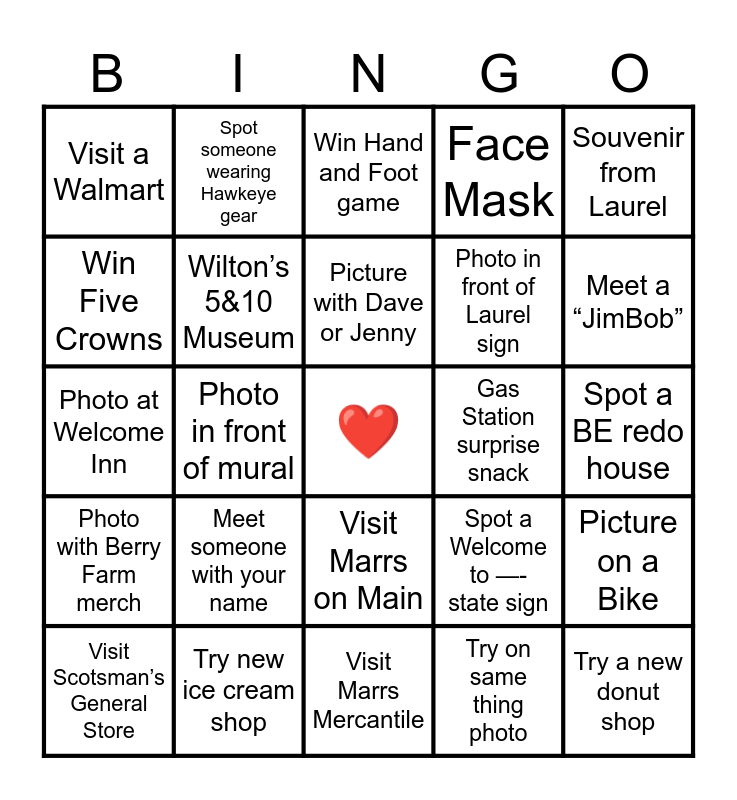 This bingo card has a free space and 26 words: Visit Marrs on Main, Try on same thing photo, Picture with Dave or Jenny, Try new ice cream shop, Souvenir from Laurel, Visit a Walmart, Win Five Crowns, Spot someone wearing Hawkeye gear, Spot a BE redo house, Spot a Welcome to —- state sign, Photo in front of Laurel sign, Photo at Welcome Inn, Picture on a Bike, Visit Scotsman’s General Store, Photo in front of mural, Visit Walmart Museum, Face Mask, Photo with Berry Farm merch, Win Hand and Foot game, Try a new donut shop, Meet a “JimBob”, Visit Marrs Mercantile, Gas Station surprise snack, Meet someone with your name, Wilton’s 5&10 Museum and Spot a D&J redo home.