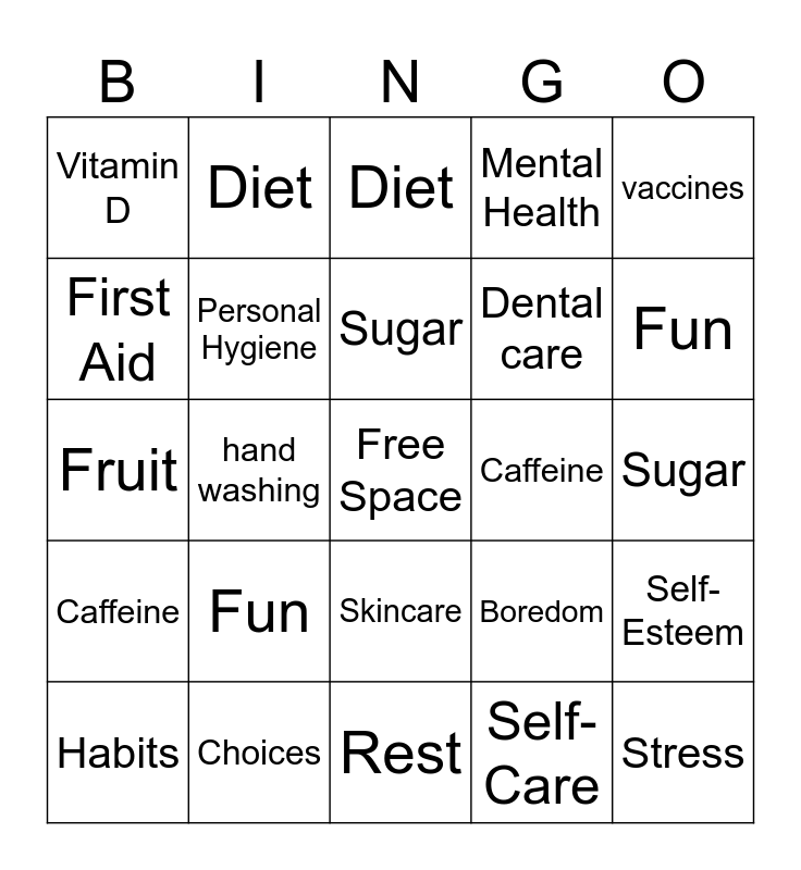 This bingo card has a free space and 52 words: Vitamin C, Stress, Sleep, Rest, Fun, Exercise, Diet, Mental Health, First Aid, Oral Hygiene, Personal Hygiene, Germs, Self-Esteem, Boredom, Skincare, Hydration, Sugar, Caffeine, Anxiety, vaccines, hand washing, Self-Care, Vitamin D, Dental care, Protein, Deodorant, Rest, Deodorant, Fun, Stress, Sleep, Mental Health, First Aid, Oral Hygiene, Exercise, Diet, Choices, Self-Esteem, Boredom, Personal Hygiene, Germs, Sugar, Caffeine, Anxiety, Skincare, Hydration, Self-Care, Fruit, Vegetables, Screen-time, Habits and Protein.