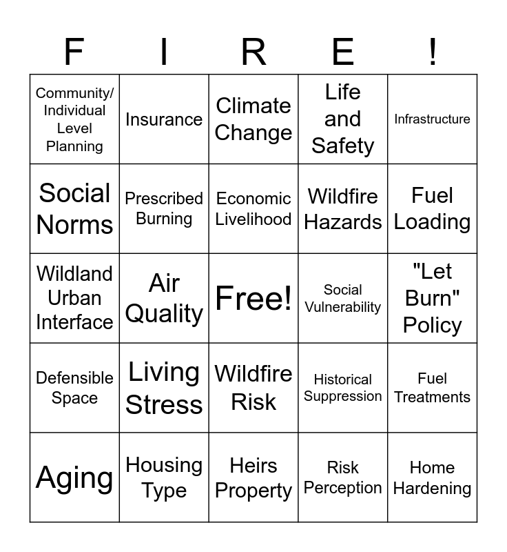 This bingo card has a free space and 24 words: Living Stress, Housing Type, Economic Livelihood, Aging, Infrastructure, Community/ Individual Level Planning, Social Norms, Insurance, Social Vulnerability, Wildfire Risk, Wildfire Hazards, Wildland Urban Interface, Historical Suppression, Fuel Treatments, Prescribed Burning, Risk Perception, "Let Burn" Policy, Climate Change, Fuel Loading, Air Quality, Home Hardening, Defensible Space, Life and Safety and Heirs Property.