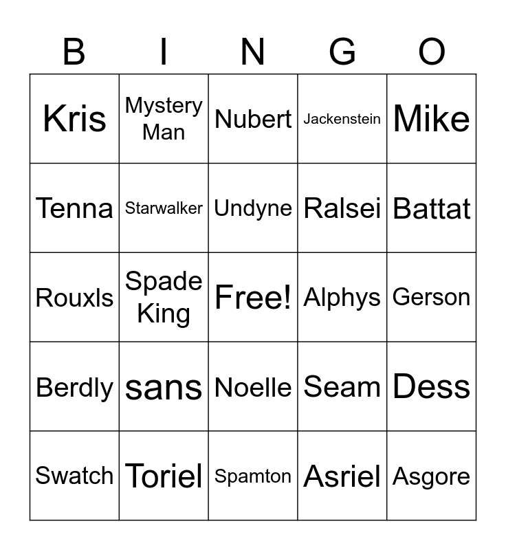 This bingo card has a free space and 29 words: Swatch, Jevil, Spade King, Queen, Kris, Nubert, Starwalker, sans, Alphys, Toriel, Gerson, Asgore, Spamton, Asriel, Battat, Susie, Noelle, Berdly, Mike, Rouxls, Seam, Lancer, Ralsei, Tenna, Jackenstein, Mystery Man, Dess, Undyne and Jockington.