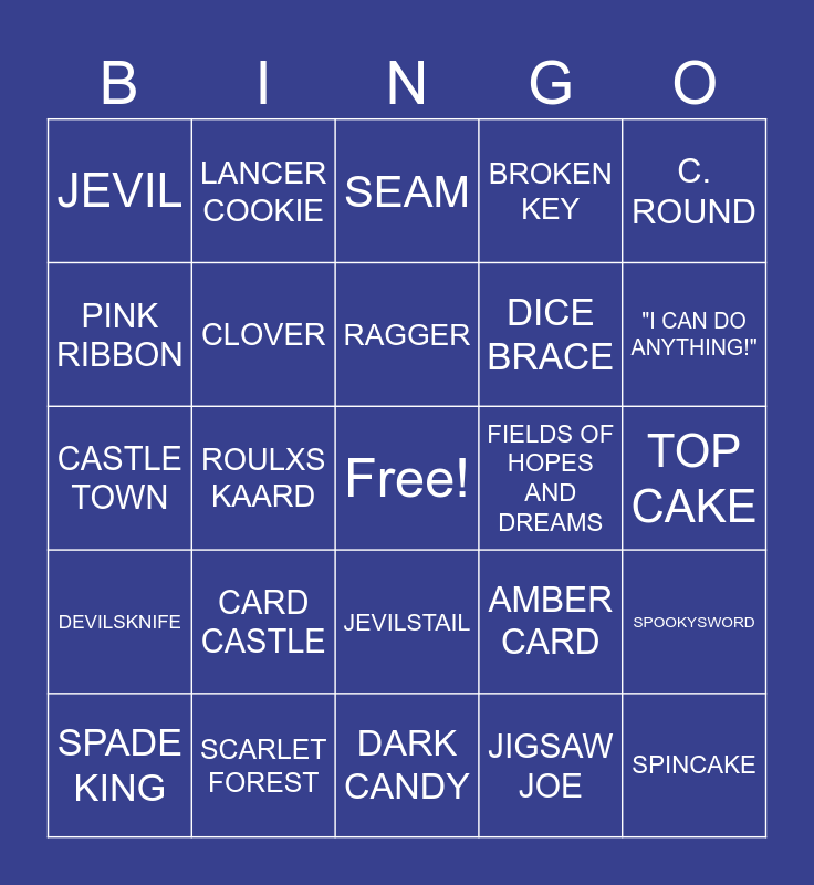 This bingo card has a free space and 29 words: SPADE KING, LANCER, ROULXS KAARD, SUSIE, JEVIL, SEAM, CLOVER, CARD CASTLE, FIELDS OF HOPES AND DREAMS, SCARLET FOREST, TOP CAKE, SPINCAKE, DARK CANDY, JIGSAW JOE, "I CAN DO ANYTHING!", "I'M THE ORIGINAL STARWALKER.", JEVILSTAIL, DEVILSKNIFE, C. ROUND, CASTLE TOWN, AMBER CARD, IRON SHACKLE, DICE BRACE, PINK RIBBON, BROKEN KEY, LANCER COOKIE, SPOOKYSWORD, RAGGER and BRAVE AX.