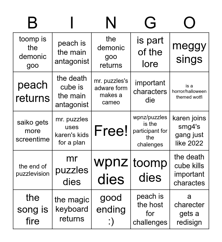 This bingo card has a free space and 24 words: mr puzzles dies, the magic keyboard returns, mr. puzzles's adware form makes a cameo, the song is fire, meggy sings, toomp is the demonic goo, peach returns, peach is the main antagonist, wpnz/puzzles is the participant for the chalenges, wpnz dies, important characters die, saiko gets more screentime, toomp dies, the death cube kills important charactes, the death cube is the main antagonist, peach is the host for challenges, karen joins smg4's gang just like 2022, the demonic goo returns, is a horror/halloween themed wotfi, mr. puzzles uses karen's kids for a plan, a charecter gets a redisign, the end of puzzlevision, is part of the lore and good ending :).