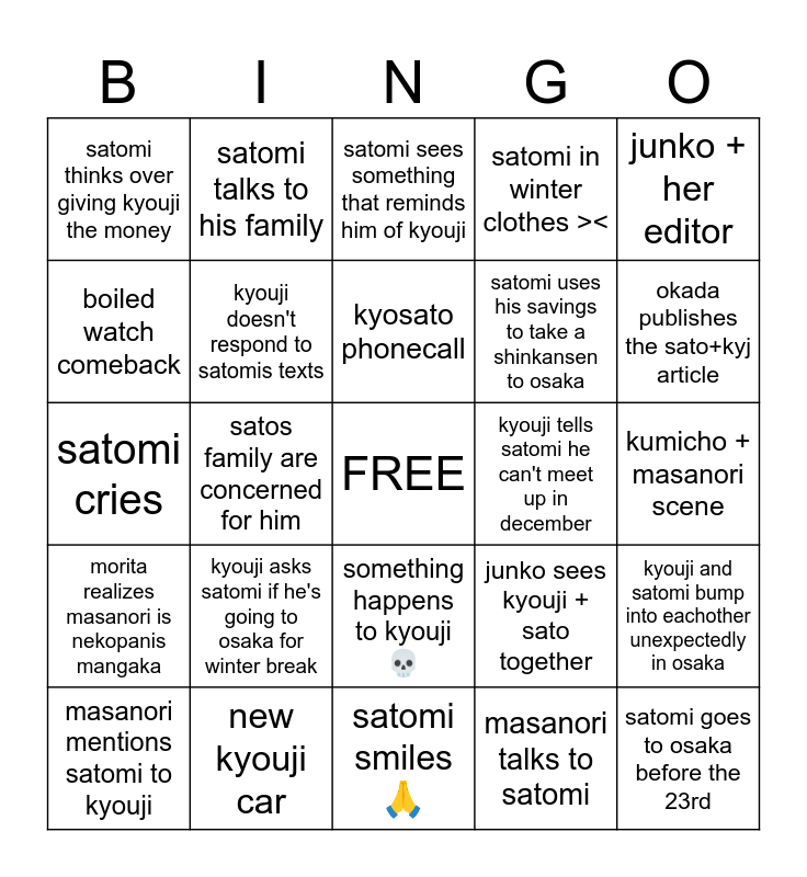 This bingo card has a free space and 24 words: kyouji asks satomi if he's going to osaka for winter break, new kyouji car, kyosato phonecall, masanori mentions satomi to kyouji, junko + her editor, satomi thinks over giving kyouji the money, boiled watch comeback, satomi talks to his family, kyouji tells satomi he can't meet up in december, something happens to kyouji 💀, satomi uses his savings to take a shinkansen to osaka, satomi cries, junko sees kyouji + sato together, kyouji and satomi bump into eachother unexpectedly in osaka, kyouji doesn't respond to satomis texts, masanori talks to satomi, kumicho + masanori scene, satomi sees something that reminds him of kyouji, okada publishes the sato+kyj article, satos family are concerned for him, satomi goes to osaka before the 23rd, morita realizes masanori is nekopanis mangaka, satomi in winter clothes >< and satomi smiles 🙏.