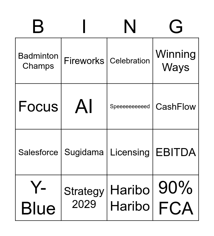 This bingo card has 48 words: Free!, Y-Blue, OIV, Diya, BIG, Wanhua, Fireworks, UPL Payments, AI, Phool jhadi, Speeeeeeeeeed, Winning Ways, $$ Money Money $$, Mulled Wine, OMP Continues..., Poker, CashFlow, Strategy 2029, Happy Diwali, Focus, EBITDA, Laxmi, Badminton Champs, Salesforce, Ravana, Sugidama, SC Informs, Lantern, Travel or not 2 travel?, 90% FCA, Festival of Lights, GSCM!, Need more HH!!, Rangoli, GT Rocks!, Impact Bonus?!, Pooja, Haribo Haribo, Boost, Good fortune, Core, exCIte, Celebration, Battery grade, Licensing, New Year, BBQ and CI Star.