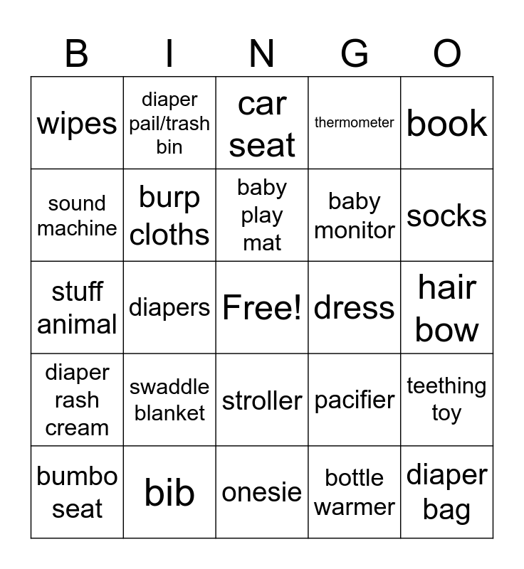 This bingo card has a free space and 29 words: bumbo seat, mittens, diapers, bottle brush, wipes, car seat, burp cloths, swaddle blanket, dress, bib, hair bow, diaper bag, onesie, bottle warmer, socks, bath toy, stroller, diaper rash cream, book, stuff animal, pacifier, spoon, baby monitor, sound machine, thermometer, diaper pail/trash bin, teething toy, baby play mat and towel.