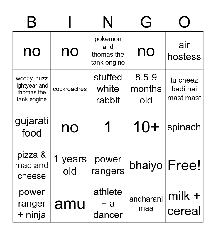 This bingo card has 28 words: Free!, mimi ayu, 8.5-9 months old, andharani maa, woody, buzz lightyear and thomas the tank engine, pokemon and thomas the tank engine, no, pizza & mac and cheese, 10+, power ranger + ninja, gujarati food, no, amu, athlete + a dancer, tu cheez badi hai mast mast, papa, 1 years old, cockroaches, stuffed white rabbit, power rangers, no, milk + cereal, 1, no, spinach, bhaiyo, air hostess and chaiya chaiya.
