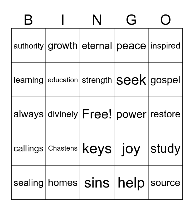 This bingo card has a free space and 24 words: Chastens, homes, strength, sealing, inspired, authority, learning, growth, power, keys, seek, always, joy, study, education, help, restore, eternal, gospel, divinely, source, callings, peace and sins.