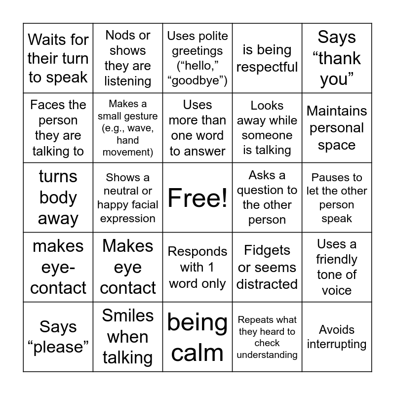 This bingo card has a free space and 24 words: Makes eye contact, Smiles when talking, Uses more than one word to answer, Says “please”, Says “thank you”, Waits for their turn to speak, Faces the person they are talking to, Nods or shows they are listening, Asks a question to the other person, Responds with 1 word only, Looks away while someone is talking, turns body away, Fidgets or seems distracted, Uses a friendly tone of voice, Makes a small gesture (e.g., wave, hand movement), Repeats what they heard to check understanding, Pauses to let the other person speak, Uses polite greetings (“hello,” “goodbye”), Maintains personal space, Shows a neutral or happy facial expression, Avoids interrupting, makes eye-contact, is being respectful and being calm.