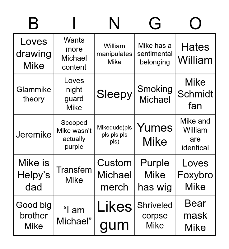 This bingo card has a free space and 24 words: Transfem Mike, “I am Michael”, Sleepy, Good big brother Mike, Hates William, Loves drawing Mike, Glammike theory, Wants more Michael content, Yumes Mike, Custom Michael merch, Smoking Michael, Jeremike, Purple Mike has wig, Loves Foxybro Mike, Loves night guard Mike, Shriveled corpse Mike, Mike and William are identical, William manipulates Mike, Mike Schmidt fan, Scooped Mike wasn’t actually purple, Bear mask Mike, Mike is Helpy’s dad, Mike has a sentimental belonging and Likes gum.