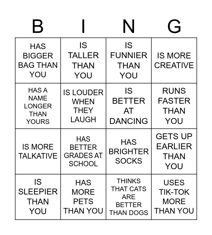 This bingo card has 16 words: HAS MORE PETS THAN YOU, GETS UP EARLIER THAN YOU, IS FUNNIER THAN YOU, HAS BIGGER BAG THAN YOU, IS MORE TALKATIVE, IS TALLER THAN YOU, HAS BRIGHTER SOCKS, THINKS THAT CATS ARE BETTER THAN DOGS, HAS A NAME LONGER THAN YOURS, IS LOUDER WHEN THEY LAUGH, IS SLEEPIER THAN YOU, IS MORE CREATIVE, HAS BETTER GRADES AT SCHOOL, RUNS FASTER THAN YOU, IS BETTER AT DANCING and USES TIK-TOK MORE THAN YOU.