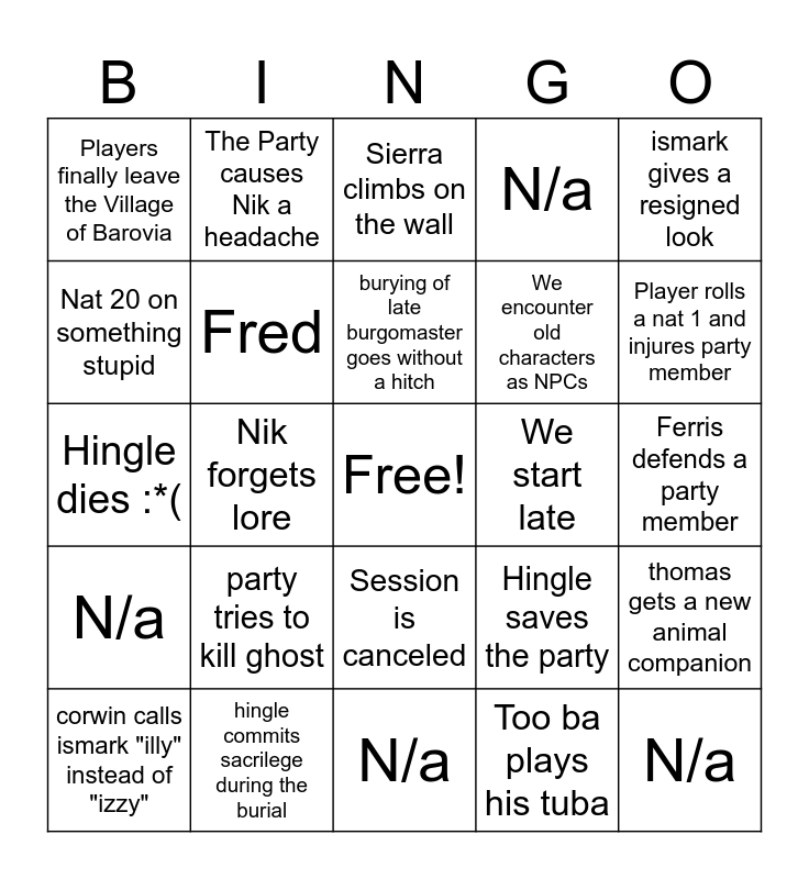 This bingo card has a free space and 24 words: party tries to kill ghost, hingle commits sacrilege during the burial, burying of late burgomaster goes without a hitch, corwin calls ismark "illy" instead of "izzy", ismark gives a resigned look, Players finally leave the Village of Barovia, Nat 20 on something stupid, The Party causes Nik a headache, We start late, Session is canceled, We encounter old characters as NPCs, Hingle dies :*(, Hingle saves the party, thomas gets a new animal companion, Fred, Too ba plays his tuba, Ferris defends a party member, Sierra climbs on the wall, Player rolls a nat 1 and injures party member, Nik forgets lore, N/a, N/a, N/a and N/a.