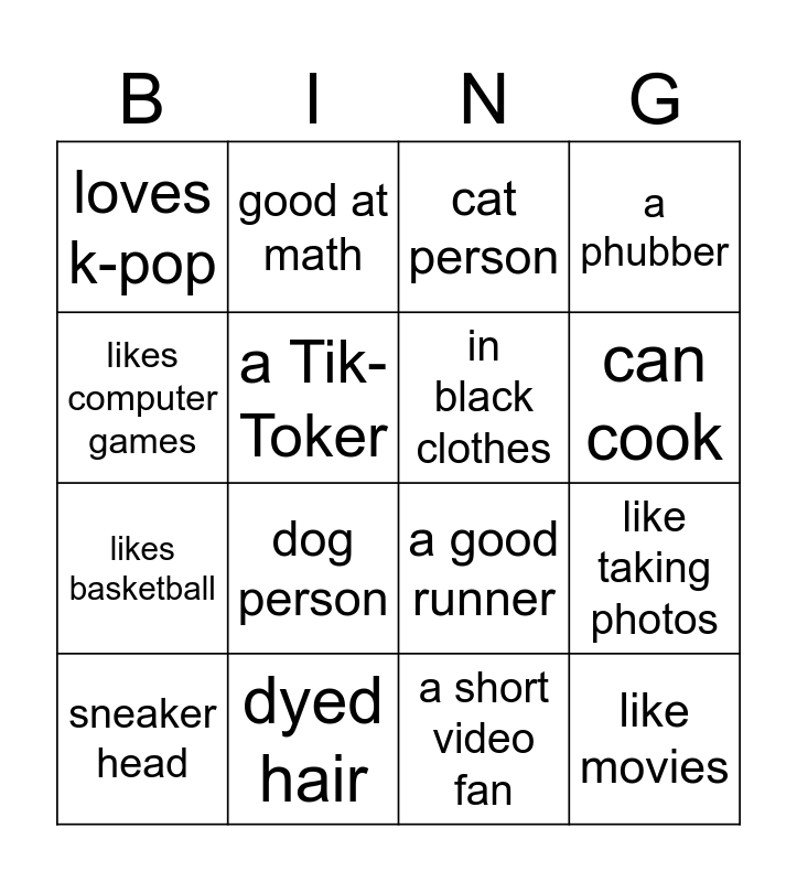 This bingo card has 25 words: likes dancing, likes singing, can cook, has a pet, likes computer games, loves k-pop, a Tik-Toker, good at math, dyed hair, hometown is outside Hubei Province, likes basketball, a good runner, a cyclist, wearing glasses, in black clothes, in black shoes, a short video fan, cat person, dog person, like taking photos, sneaker head, a football fan, like movies, a phubber and travelled in national days.