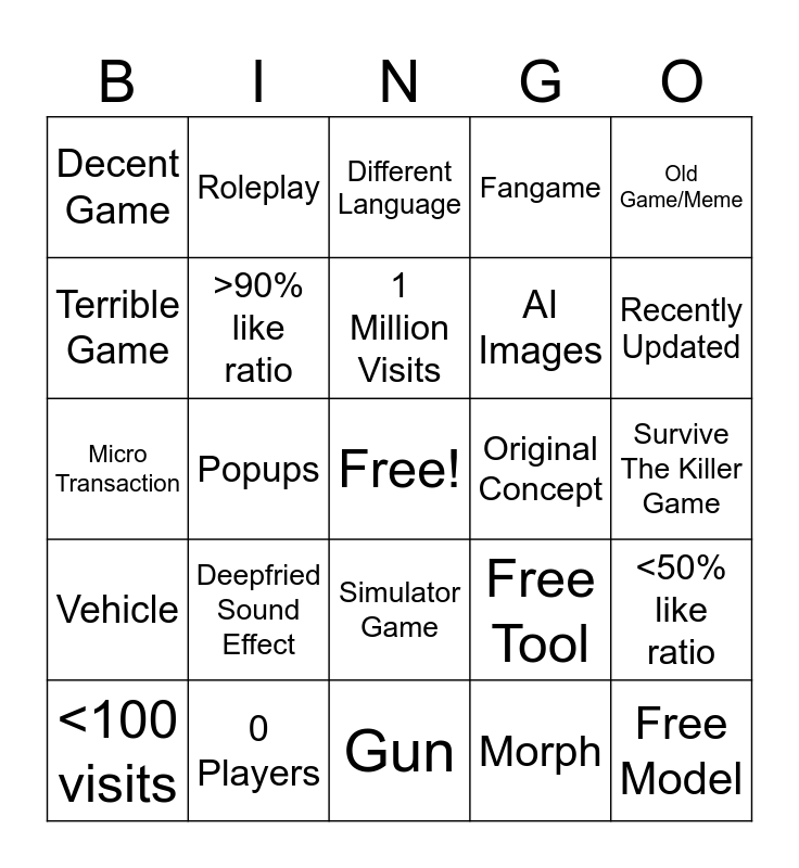 This bingo card has a free space and 24 words: Deepfried Sound Effect, 0 Players, 1 Million Visits, <100 visits, Old Game/Meme, Decent Game, Terrible Game, Roleplay, Original Concept, Simulator Game, AI Images, Micro Transaction, Free Tool, <50% like ratio, >90% like ratio, Morph, Survive The Killer Game, Different Language, Recently Updated, Popups, Free Model, Vehicle, Fangame and Gun.